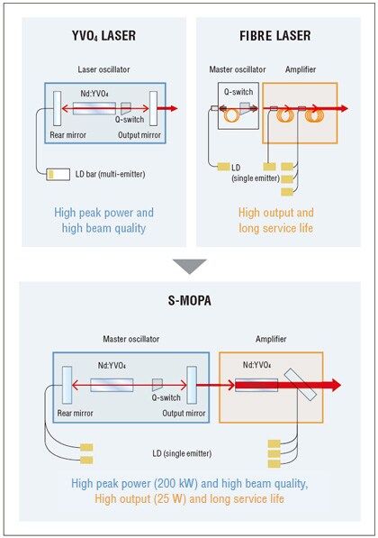A high quality YVO4 laser is used as the master oscillator and then fed into a FIBRE technology based amplifier to combine the best of both technologies. By using a single emitter laser diode, a long service life expectancy can be achieved compared to conventional technology.