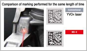 The MD-X1500 Series achieves a peak power of 200 kW, which is approximately twice the peak power of conventional YVO4 lasers. The MD-X1500 Series combines a high peak power with a short pulse width (4 ns) to minimise the damage caused by heat transfer to the target. This makes the MD-X1500 Series the optimal laser marker for applications where it is necessary to eliminate the effect of heat transfer such as marking on resins or plastics.