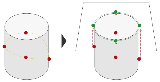 Some elements have three-dimensional shapes such as cylinders and cones, but some elements do not have three-dimensional shapes such as lines and circles. These elements are generally projected on a plane (moved perpendicular to the plane direction) so that they can be measured correctly. The plane that is projected is called the reference plane or projection plane.