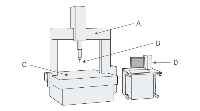 A: Moving bridge, B: Trigger probe, C: Stage, D: Controller