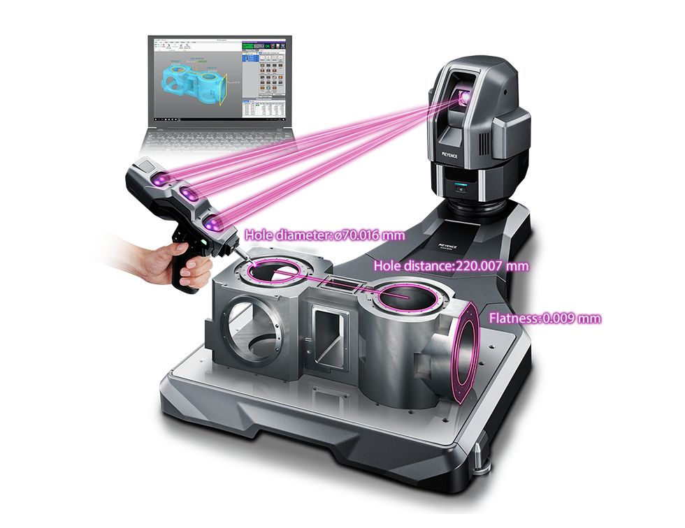 The XM Series is a handheld coordinate measuring machine (CMM) that lets anyone easily measure 3D/GD&T features. The system is portable and shop-floor ready, so measurements can be taken in any location. The unit also automatically records measurement data and creates detailed inspection reports. The images showcases our latest XM-5000 model which allows high-accuracy measurement for palm-sized parts to large applications.