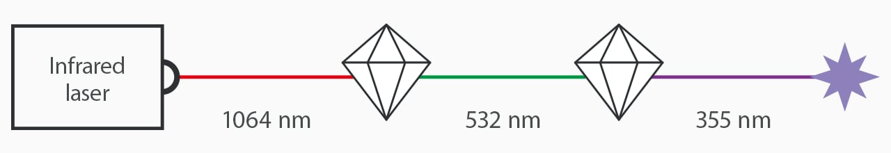 First, a 1064 nm laser is converted into a 355 nm laser through two crystals. Then, the 355 nm beam breaks down bonds directly using a photolytic degradation process. This process is known as “cold marking” because it does not burn surface areas and uses minimal heat stress. KEYENCE’s UV laser marking machine is the 3-Axis UV Laser MD-U Series.