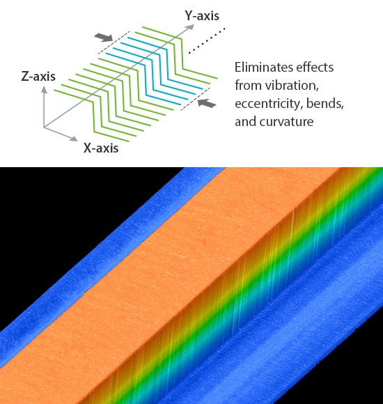 When creating a 3D image, the positions of each 2D profile are adjusted in the X, Z, and θ directions. This eliminates the impact of vibration and eccentricity as well as bends and curvature in the target, creating an optimal image for inspection.