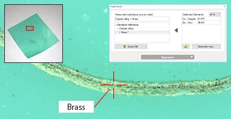 After using magnified observation (100×) to confirm the presence of foreign particles in a multi-layer film, elemental analysis was performed with the EA-300 Series laser-based elemental analyzer, detecting copper (Cu) and zinc (Zn), indicating brass. This immediate identification of the material of the foreign particle quickly provided the basis of the determination of how the foreign particle ended up in the film, helping to identify which processes needed to be improved and significantly reducing the time spent on establishing countermeasures.