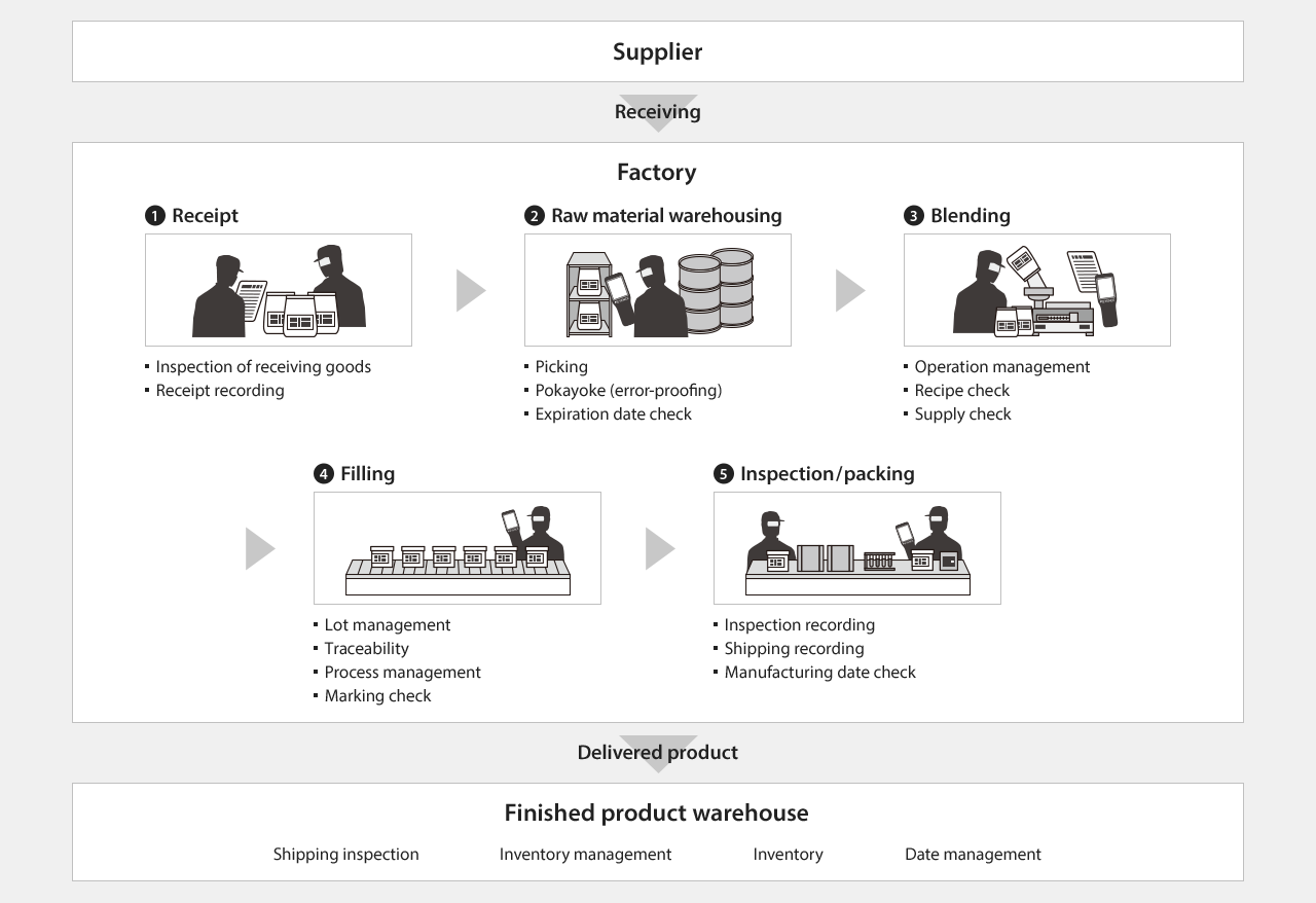 At manufacturing worksites for items such as food, medicine, and cosmetics, it is easy for mistakes to occur in receiving order and shipping due to the large number of items that are handled and the large number of similar products. There are also concerns regarding problems such as the wrong raw materials being taken during inventory management, picking, and blending. Furthermore, because not only finished products but raw materials also have best-before dates and expiration dates, thorough management of these dates is absolutely necessary in the manufacturing of food, medicine, and cosmetics. A single mistake can lead to a product recall, which not only generates major losses but can also greatly damage the brand image.