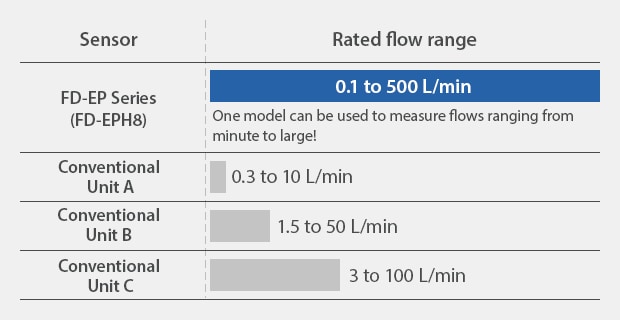 Conventional air flow sensors have a different rated flow range depending on the model, even for the same tube diameter, making it very difficult to find the appropriate model for novel applications. The FD-EP Series can handle flows ranging from minute to large, eliminating the need to worry about the rated flow. Choosing a product is as easy as selecting the tube diameter.