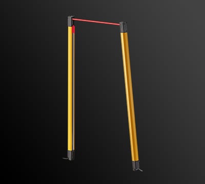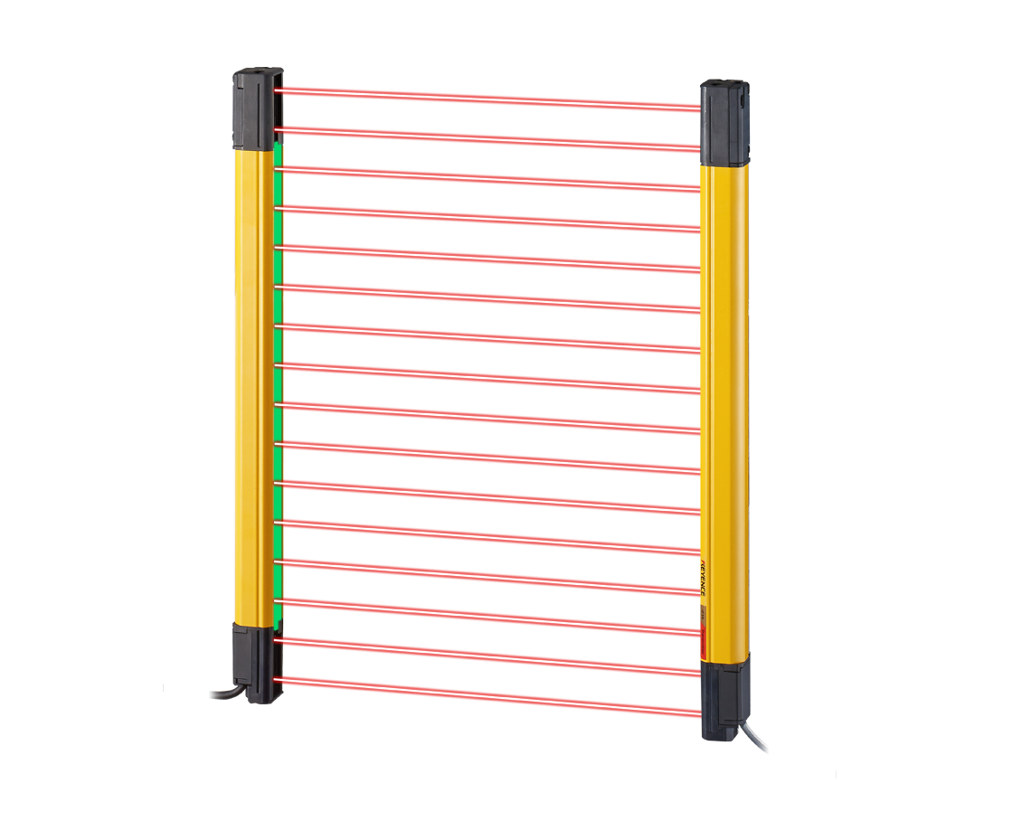 A safety light curtain uses an array of photoelectric sensors that, when interrupted, will send a signal to stop a machine or hazard if an area is breached. Unlike typical photoelectric sensors, safety light curtains monitor themselves through redundant signals and will stop the hazard (ex. machine) if an internal fault is detected.
