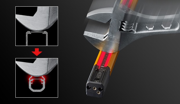 What makes a light curtain "robust"? KEYENCE has designed a light curtain with a structure that prevents damage from parts or tools by narrowing the exposed lens area and recessing it in an impact resistant housing.