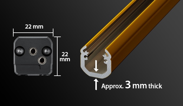 Although small in size (22 × 22 mm), the GL-V Series has approximately 3 mm thick robust body and features a twin bumper structure to protect the lens surface. The environment-resistance enclosure rating meets IP65/IP67 standards.