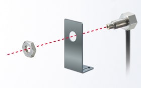 To prevent such errors, select a thrubeam sensor with a small optical axis or use a slit to reduce the optical axis when detecting small targets. Doing so will stabilise detection while still providing an area large enough to capture the target.