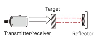 Retro-reflective models detect the amount of light returned from a reflector installed opposite of the transmitter. The light from the reflector is blocked as a target passes through, reducing the amount of received light. Targets are detected by measuring this reduction. Installation is easy with detecting distances ranging from a couple of inches to several feet. Detection is also less likely to be affected by target colour or angle, and opaque targets can be detected regardless of shape, colour, or material.