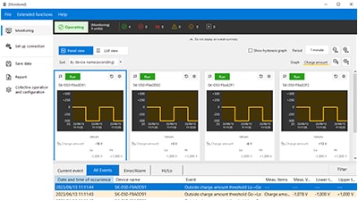 Standard specifications include an independent 3-output judgement system and analogue voltage/current output to collect and output the static electricity volume of the target as well as the temperature and humidity data of the surrounding area. By using a communication unit, data from up to 8 connected main units and expansion units can be transmitted simultaneously. The ability to read data and re-write settings from PCs and PLCs contributes to a significant reduction in man-hours required for setup and operation.