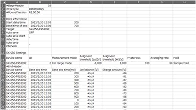 Install the SK-050 sensor in front of and behind the ionizer to save the effects of static elimination—which can vary depending on target and environment—in chronological order to a PC. This is useful for verification during installation, changeover, and periodic inspections.