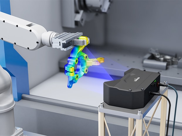 Once machining is complete, the workpiece can be unloaded by a robot and presented to the LJ-S8000 Series to undergo 3D dimensional inspection. Using the calibrated 3D data helps improve quality and ensure that tolerances are met.