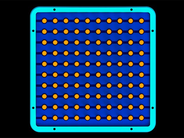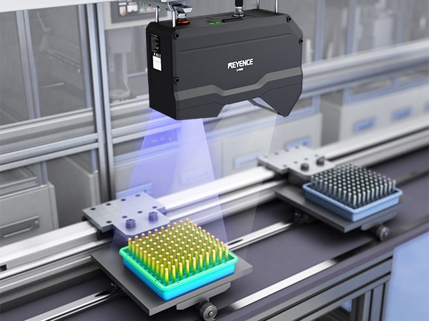 The LJ-S8000 Series can be used to identify the types of injectors arranged on a pallet. With a wide field of view of up to 640 × 640 mm, mixed product types can be easily detected shortly after installing the system.