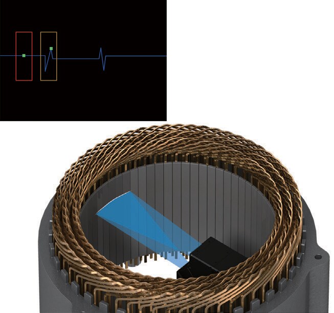 Inspects if the position of insulating paper is correct after assembly of the rectangular wire. The LJX Series allows for highly accurate measurements, even when multiple materials such as metals, rectangular wire, and paper are used together.