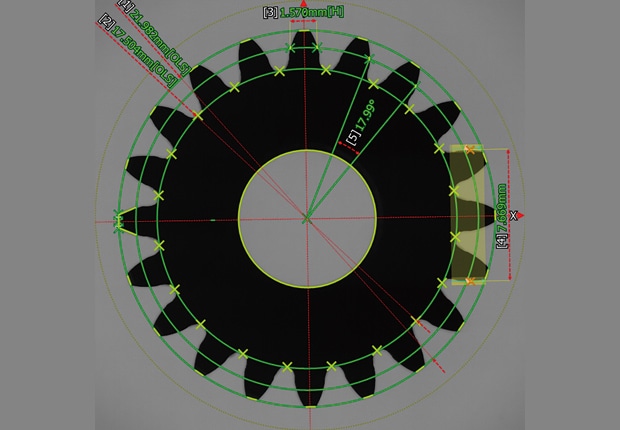 Peak circle, tooth pitch angle, coaxiality, PCD, and similar factors can be easily measured using virtual lines.