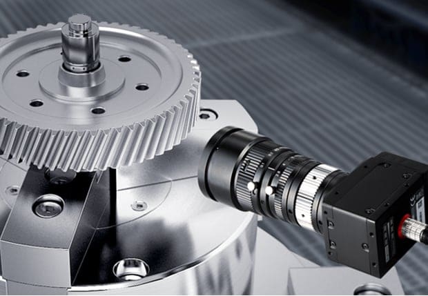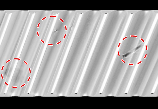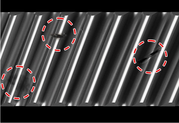 For the inspection of the sides of cylindrical targets such as gears for remaining black scales, stains, flaws, or dents, it was difficult to apply lighting evenly. With a line scan camera, images of cylindrical shapes can be captured continuously. Also, LumiTrax™ specular reflection mode allows for the detection of linear flaws, dents, and stains with a single captured image.