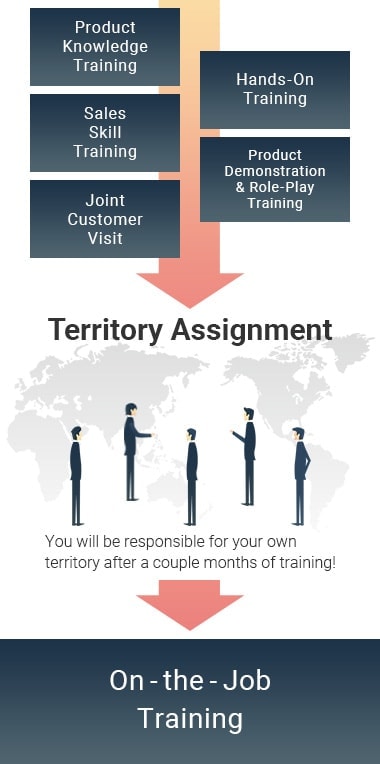 The purpose of the on-the-job development period is to apply what you learned in classroom training to the actual job, identify areas for improvement and seek advice, and then improve and refine your skills as this cycle continues. There are many opportunities for you to have on-the-job learning at new hire training and after your territory assignment. All employees are here to support your growth - at your assigned office and at HQ.
