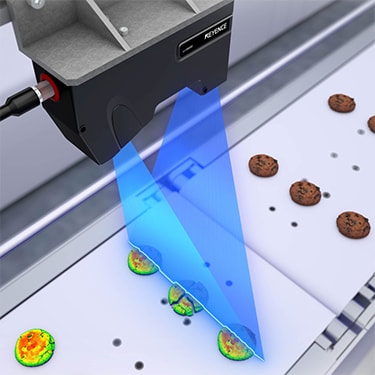 The laser profiler's wide field of view makes it possible to inspect multiple targets traveling on a conveyor belt together. 3D position correction can be used to identify and inspect each cookie within the measurement range, enabling accurate sorting to improve quality and eliminate waste.