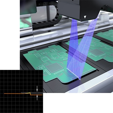 Conventionally, a vision sensor was used for OK/NG judgement based on the area. Since the LJ-X8000 Series can measure the volume and position of paste application, it can reduce material costs and support higher component densities.