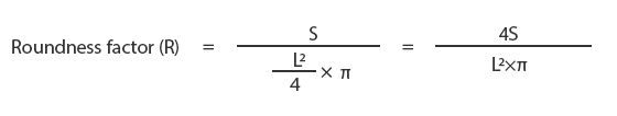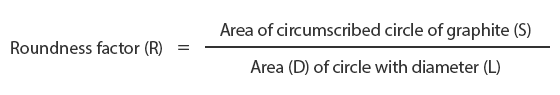 The roundness factor (R), used to evaluate graphite nodularity, is determined by observing the graphite in the material and calculated using (L) the maximum diameter, (S) the area of the graphite, and (D) the circle using (L) for its diameter.
