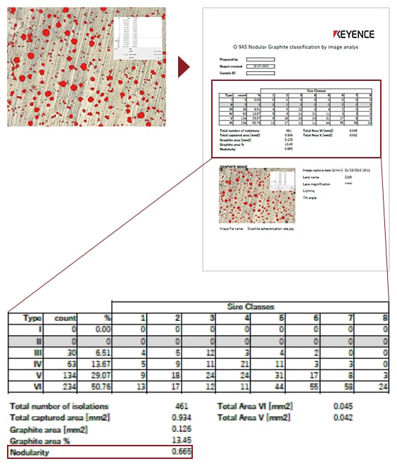 The VHX Series digital microscope can not only automatically measure graphite nodules with high accuracy but can also automatically create reports using the acquired image and numeric data.