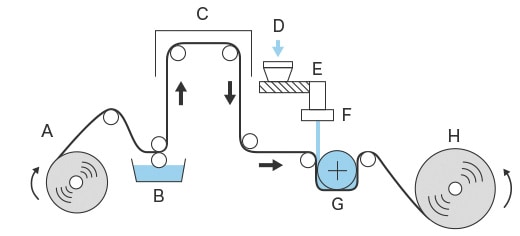 - Extrusion laminating is a process that utilises extrusion moulding, a type of injection moulding technique. The substrate is precoated with an adhesion additive (anchor coat), and the material is melted by heat and extruded into an even, flat sheet through a die with a slit (T-die) as it is applied over the substrate. The material is compressed and solidified by the cooling roller to achieve bonding with the substrate. High-performance films can be created by “sandwich lamination” where three layers are bonded, “tandem lamination” where five layers are bonded, and multilayering by co-extrusion of multiple different material using a T-die.