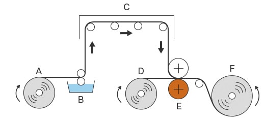 - After adhesive or glue is applied to the first substrate, it is bonded with the second substrate, which is made of a different material. Using adhesive tape or other adhesion methods used in manufacturing, the substrates are bonded through a drying or heating process according to the properties of the adhesive or glue. Then, substrates are rolled up.