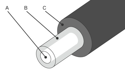The core in the centre of the fibre is the transmission path for light. The cladding is a layer of material having a lower refractive index that encloses the core.