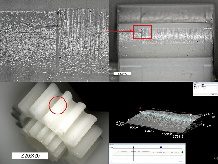 While minute exterior problems on plastic parts tend to have low contrast that makes them difficult to observe with conventional microscopes, the VHX Series 4K Digital Microscope can clearly capture contact indentations caused by dimensional or assembly errors.