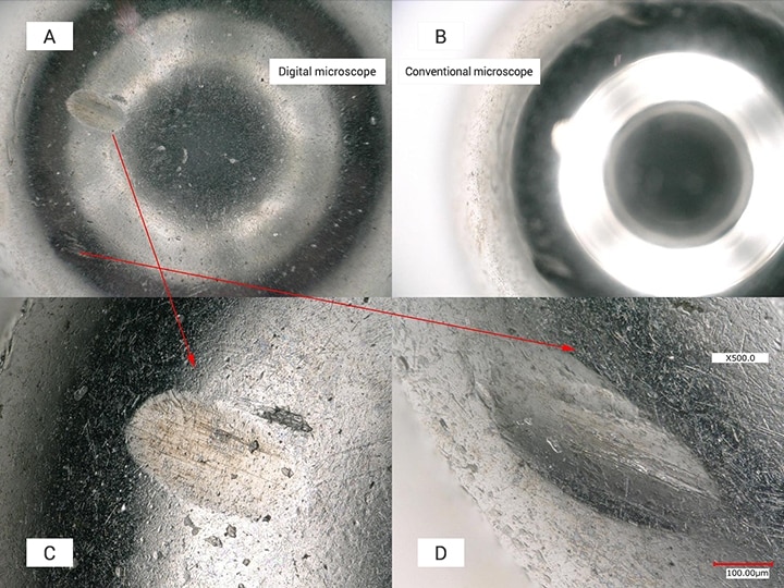 The VHX Series 4K Digital Microscope has glare removal and ring-reflection removal functions that eliminate reflected light. The new 4K Digital Microscope enables users to distinguish between fine hairline scratches, friction-inflicted dents, and adhesions to allow for a more accurate understanding of the wear and friction conditions.