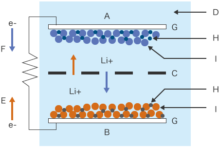 - G) Current collector: Plays the roles of an electrical conductor to collect the generated electricity and of a support material. The positive electrode is aluminium foil, and the negative electrode is copper foil.