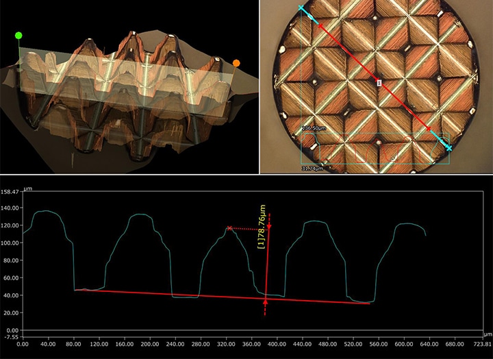 2D/3D measurements, such as two points, parallel lines, height, and areas, can easily be taken by selecting the specified locations on the image. For instance, users can easily measure the outer diameter of the probe pin tips to understand wear in seconds or draw a virtual cross section to measure the height of the pins.