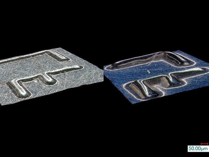 The 3D-displayed stamping surface of the punch tip can be rotated in any direction for efficient observation of microscopic shape changes and surface conditions. Accurate 2D/3D measurements can be easily captured and recorded, making it possible to find trends in wear.