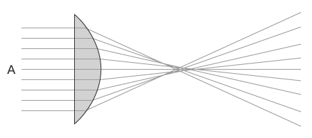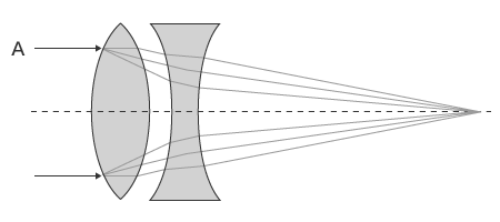 Chromatic aberration occurs due to differences in the wavelengths of light. Aberration, however, occurs even with a single colour, called monochromatic aberration. A typical example is spherical aberration. A convex lens surface is in the shape of part of a sphere. Therefore, the closer a point is to the edge of a lens, the larger the incident angle, which then increases the refraction angle. The phenomenon in which the focal position differs between points close to the lens centre and points further away from the lens centre is called spherical aberration.