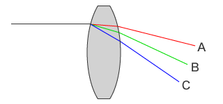 As shown in the following figure, the focal position of light with short wavelengths is close to the lens and that of light with long wavelengths is further away from the lens due to the dispersion of light. When light with a specific wavelength is brought into focus, light with other wavelengths becomes out of focus, which blurs the colours of the image. This phenomenon is known as chromatic aberration.