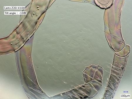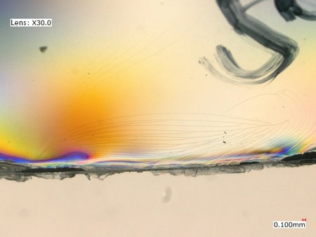 Observation with transmitted polarised illumination visualises residual stress, foreign particles, and cracks.