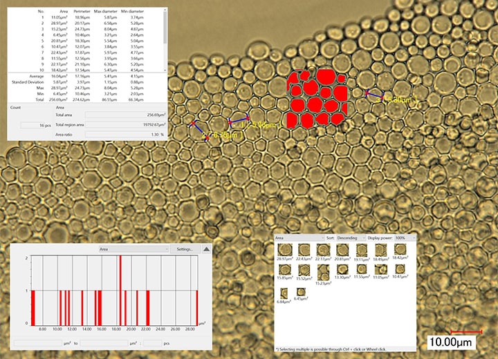 The automatic area measurement/count function automatically measures and calculates detailed values—such as the average area, standard deviation, maximum value, minimum value, area ratio, and other items related to bacteria in the selected area as well as the accurate count, area, perimeter, maximum diameter, and minimum diameter of the bacteria—and then displays these values in a list.