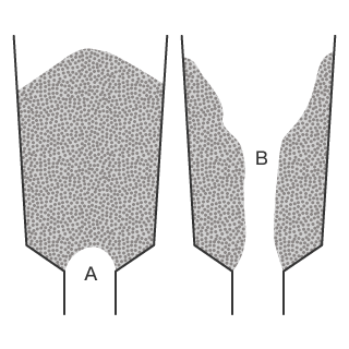 Powders with a low fluidity, such as wheat flour, do no spread on the horizontal plane, maintaining their shapes when piled in a conical shape. Powders with a low fluidity are hard to discharge from hoppers and silos, and may form bridges or ratholes.