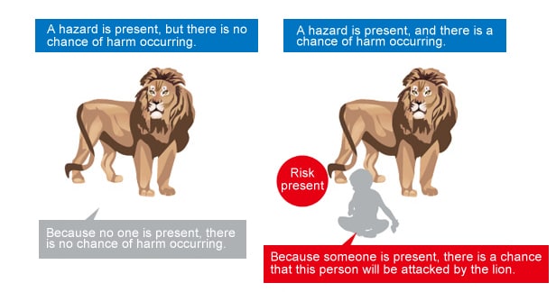 In the picture on the left, there is a lion, which is a hazard, but this alone is not enough to cause harm to occur. In the picture on the right, a person is present. This introduces the possibility of harm occurring should the lion attack the person. The picture on the right indicates a situation in which “risk” exists. It is necessary to understand that this situation is distinct from the situation in which a “hazard” exists.