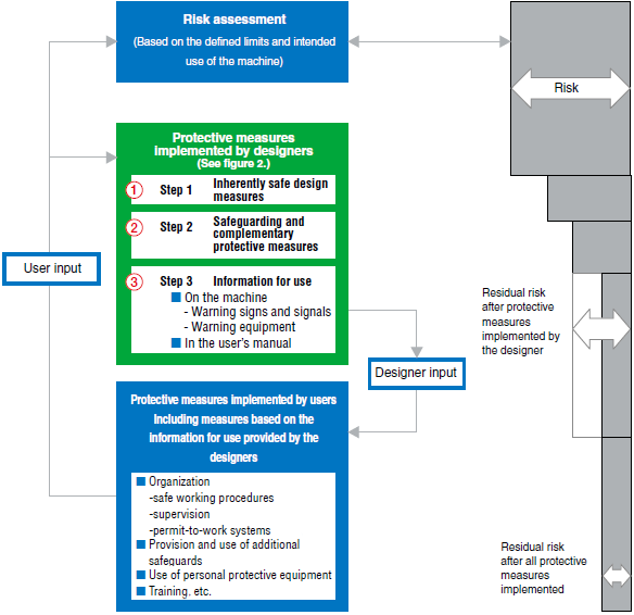These are measures designed with the purpose of achieving risk reduction. Protective measures can be separated into two major groups: protective measures implemented by designers and protective measures implemented by users.