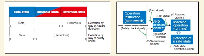 - These systems only permit the operation of a machine after safety has been confirmed. This is a method for constructing definite safety. In detail, it can be said the starting and running of machines is permitted by these systems only when they detect the absence of users in the operation range of the machine.