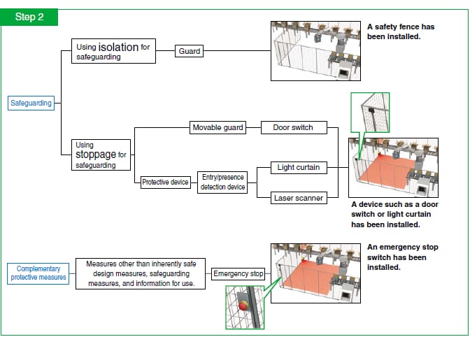Safeguarding by way of isolation and by way of stopping. For the former, guards (protective fences) are most commonly used. For the latter, light curtains or laser scanners are used as one method. Complementary protective measures (for example, emergency stop switches) are measures that differ from inherently safe design measures, safeguarding, and information for use and that are necessary due to risk existing because of the intended use and the reasonably foreseeable misuse of the machine. In the 3-step Method, these measures are positioned in step 2 together with safeguarding. An example of these complementary protective measures is an emergency stop device.