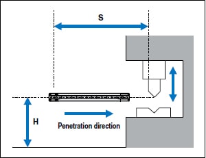 When installing a safety light curtain or other electrical detection protective device, refer to the minimum required distances for stopping the machine prior to the body reaching the hazardous zone when the body enters the detection zone. These distances are defined in standards such as ISO 13855. When installing a light curtain, be sure to provide the safety distance (minimum distance) determined by sources such as the standards, regulations, and laws of the country or area in which the light curtain will be used.