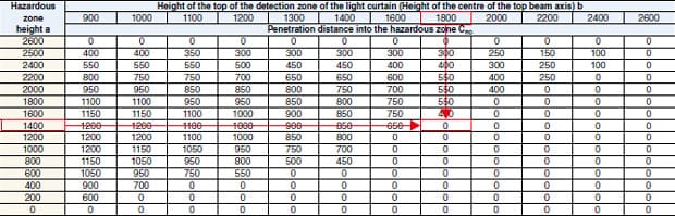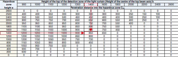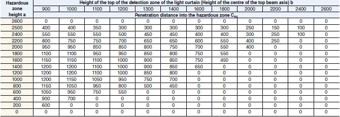CRO is determined as shown in the following table according to the values a (height of the hazardous zone) and b (height of the top of the detection zone of the light curtain).