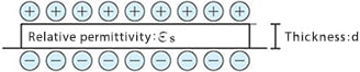 If there is an insulator between the conductor plates, the (relative permittivity of insulator) capacitance can be expressed as follows: