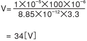 If a polyimide film (thickness: 100 [μm], relative permittivity = 3.3) that is closely attached to a grounded conductor plate as shown in the picture below has a surface charge density σ (= 1×10-5 [C/m2]), the surface potential is: