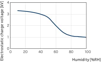 The graph on the right shows how static electricity is naturally discharged as humidity increases. As a guideline, static electricity is less likely to occur at relative humidity of more than 65%. Even if it does occur, it dissipates naturally at these relative humidities.
