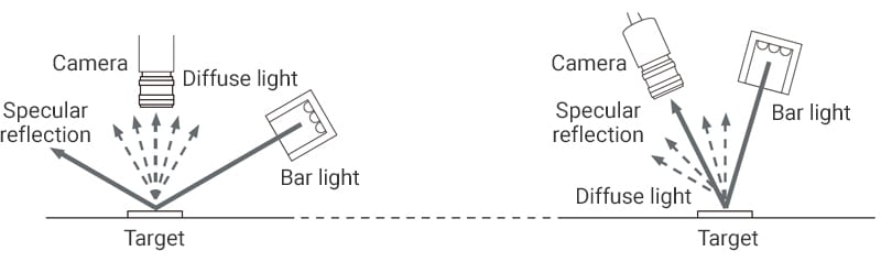 Bar lights can be used to apply a strip of light along a target edge. Depending on the alignment of the light and the camera, the bar light can be used to enhance or reduce specular reflection from a target. For highlighting a feature with specular reflection (such as the tip of a pin), the direct reflection of light has to come back into the camera. For removing specular reflection (sometimes referred to as hotspots), the direct line of reflection needs to be away from the camera.